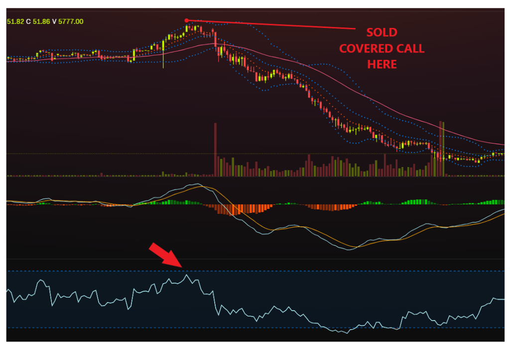Below is a Covered Call that I sold today. By looking at volume and the RSI Indicator at the very bottom I could make an educated guess that the stock was currently overbought and due for a pull back in price soon. Covered Calls make money when there is a pull back in price so you profit even when the stock you own goes down. They’re hedging instruments, after all.