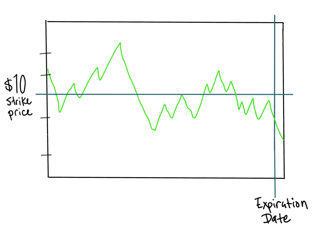 As pictured above, if the stock price is below the $10 strike price by expiration I get to keep my shares and the $80 premium. If the price of the stock is above the strike price at expiration then I sell 100 shares at $10 a piece while also keeping the $80 premium.