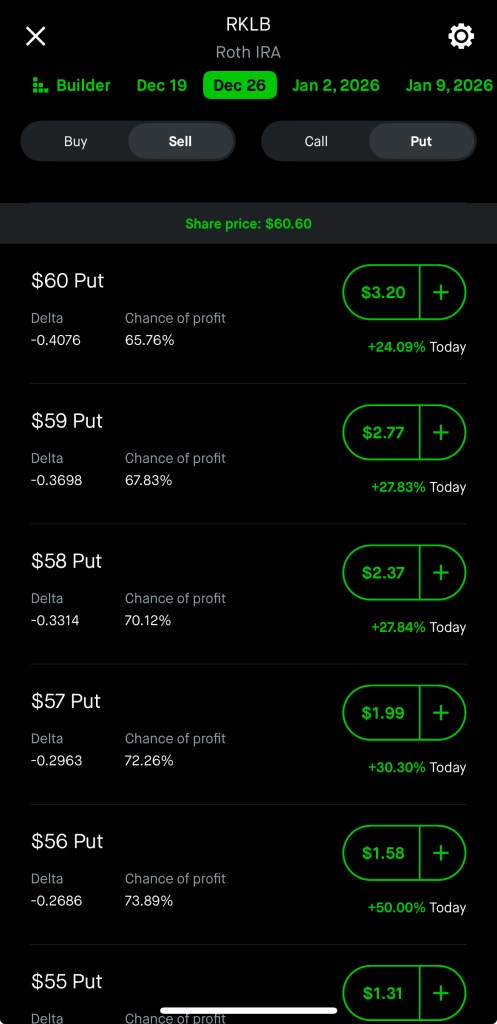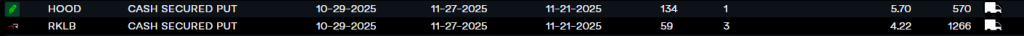 This first example is for Rocket Lab (RKLB). I sold 3 Cash Secured Puts at the $59 strike price that expired in one month while the stock was trading for around $65. This means that if the stock price is at $59 or below in one month, I am obligated to buy 100 shares at that price per contract, so 300 shares total for 3 contracts.