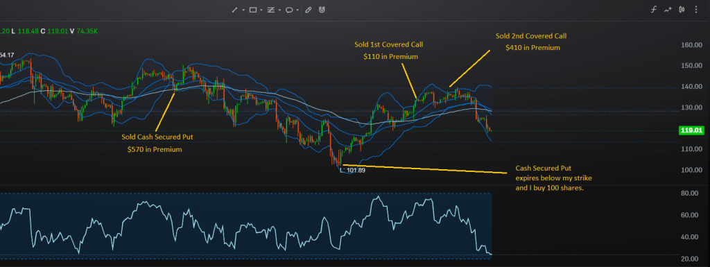 In the chart below, you’ll see I did the same thing with Robinhood (HOOD). While the stock was trading around $140-145, I sold a Cash Secured Put with a strike price of $134 that had a one month expiration. I was paid $570 to sell that contract. Afterwards the stock dropped way down and I was forced to buy 100 shares on the expiration date.