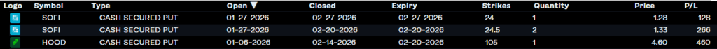 As you’ll see, because of my heavy losses, I haven’t been able to trade as much recently. I sold 4 Cash Secured Puts on SOFI and HOOD, and I was assigned on all of them. Meaning, I had to buy 400 shares of stock at a price way above their current market value, while keeping the $854 in premium I received for selling those contracts.
